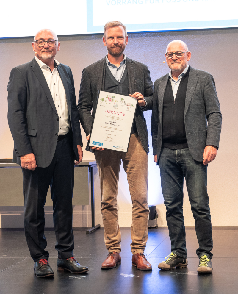 Der im Landratsamt Rhein-Neckar-Kreis für Mobilität zuständige Dezernent Dr. Christopher Leo (Mitte) erhielt von Verkehrsminister Winfried Hermann (rechts) und dem AGFK-Vorstandsvorsitzender Günter Riemer (links) die Urkunde überreicht.