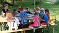Da so eine Hoferkundung hungrig macht, konnten alle nach ihrer Rückkehr schmecken, was für leckere Kartoffelpuffer man aus den Früchten des Ackers zaubern kann. Heiderose Treml hatte schon gemeinsam mit Elke Karrasch zu Hause aus rund 10 Kilo Kartoffeln Teig für die hungrige Schar vorbereitet und am Hof frisch ausgebacken, so dass alle Kinder den Weg der Kartoffel vom Feld bis in den Magen selbst erleben konnten. Apfelmus und Kräuterquark waren die passende Beilage. Der leckere Apfelsaft zum Durst löschen an diesem heißen Tag, war gesponsert vom Obsthof Gefäller. Die wespensichere Trinkgläser mit Deckel und Strohhalm durften die Kinder als Erinnerung mitnehmen. Machte das Wetter auch einmal einen unsicheren Eindruck, so blieb der Nachmittag doch sonnig, so dass die Eltern beim Abholen der Kinder auch noch etwas unter den Bäumen am Lagerfeuer verweilen konnten, an dem die Kinder zum Abschluss noch ihr Stockbrot rösteten. | |||