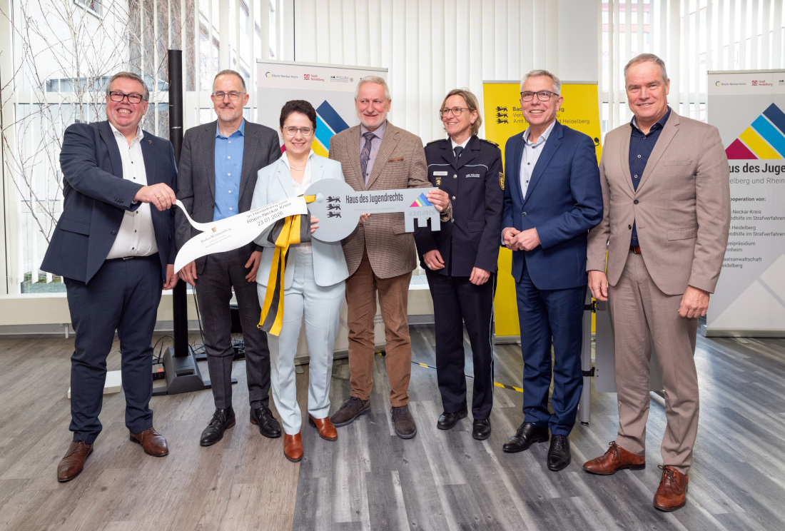 Gute Stimmung bei der symbolischen Schlüsselübergabe (von links): Marco Grübbel, Leiter des Amtes Vermögen und Bau Baden-Württemberg Mannheim und Heidelberg, Leitender Oberstaatsanwalt Andreas Herrgen, Justizministerin Marion Gentges, Staatssekretär des Innern Thomas Blenke, Ulrike Schäfer (Polizeipräsidentin des Polizeipräsidiums Mannheim), Landrat Stefan Dallinger und der Heidelberger Oberbürgermeister Prof. Dr. Eckart Würzner (Quelle: Landratsamt Rhein-Neckar-Kreis)